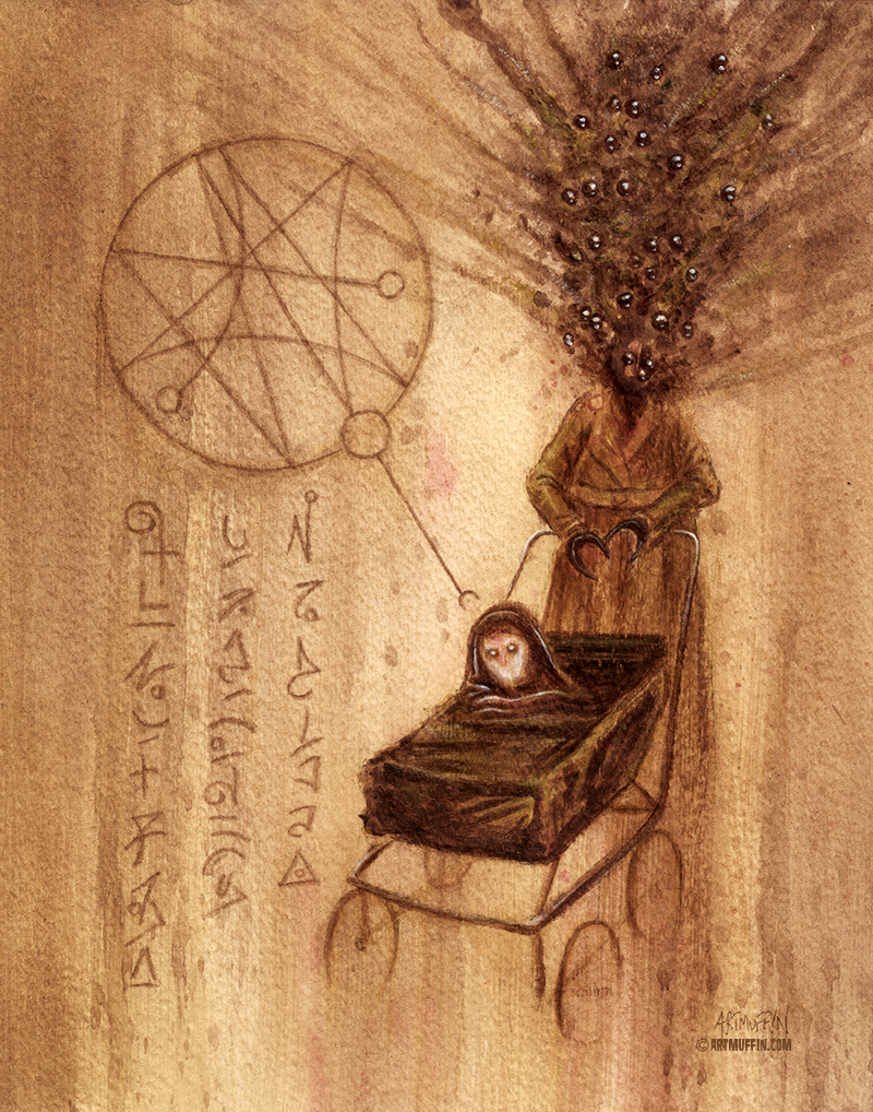 Creatures seem to be mimicking human behavior but is unknown what is really going on or what's happening to the creature pushing the stroller. It appears the younger creature being pushed is the one the page is more focused on based on the symbols and writing but of course any actual translation is unknown.