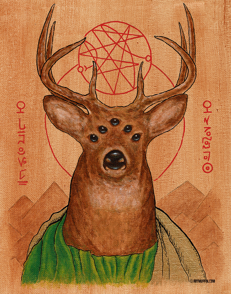 Very likely based on a deer from planet earth. Did they see them here or do they have them on their planet? Do their deer have 5 eyes? Perhaps this is part of their folklore or a ceremony that they have or believe in. Why is it wearing clothing? Strange symbols in red make it stand out more than most of the other writing and symbols in pages found to date. Is this from the same book? The background seems to have layers of pyramids more so than the mountains. Perhaps this is a city. Or it could be representations of mountains. The writing seems to start with the same symbol, is that significant?