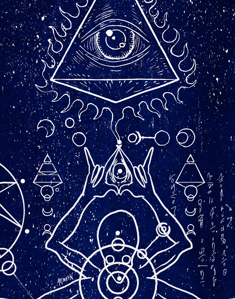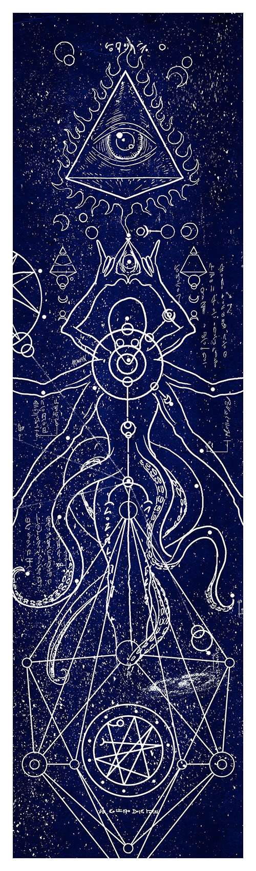 "Alien Constellations" is one of a series of 3 skateboard deck designs I did for Devil Street Decks. The theme was "Let The Old Souls In". I'm a big fan of the idea of quantum universes and elder gods and the powerful mystery that such ideas hold. The intention of my work is almost always to leave the user with a sense of wonder while giving them a small piece of what may be a story from another time, culture or dimension.