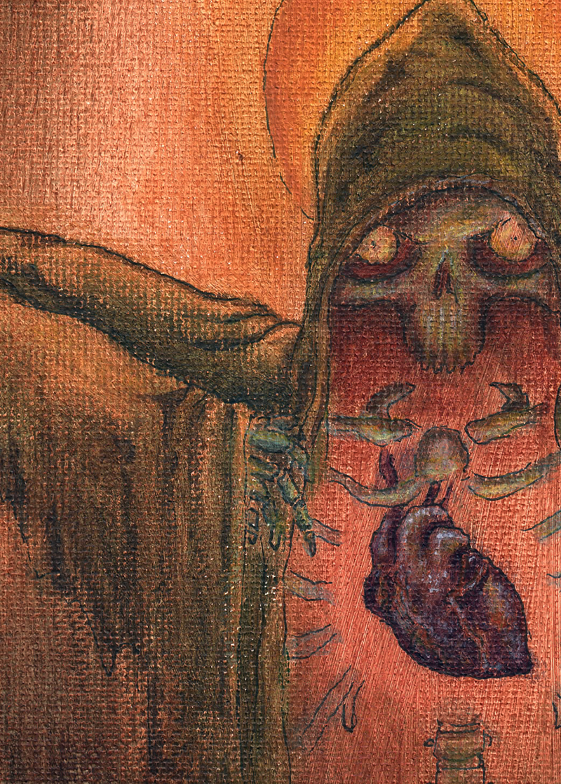 This 11" x 14" print is printed on 110lb. silk card stock (that's means it's kinda shiny, but not too shiny). This painting was one of a series entitled "13 Days of Horror". 13 pieces, one new piece each day for 13 days leading up to Halloween. The original is 8"x10" mixed media on canvas. This print is an enlarged version (which shows the canvas texture quite nicely) at 11"x14". Price includes shipping in the continental U.S. All prints are shipped signed by me unless requested otherwise.
