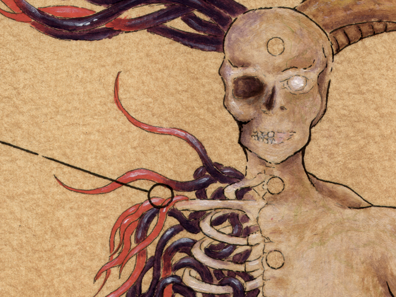 This piece is printed on 110lb. medium gloss card stock. One of numerous pages of the Book of Gosh. It shows what appears to be a hybrid human with anatomy, as well as sigils and writing for what might be an explanation or incantation. It's hard to know what we're looking at and translation has failed at this point with our current translation software.