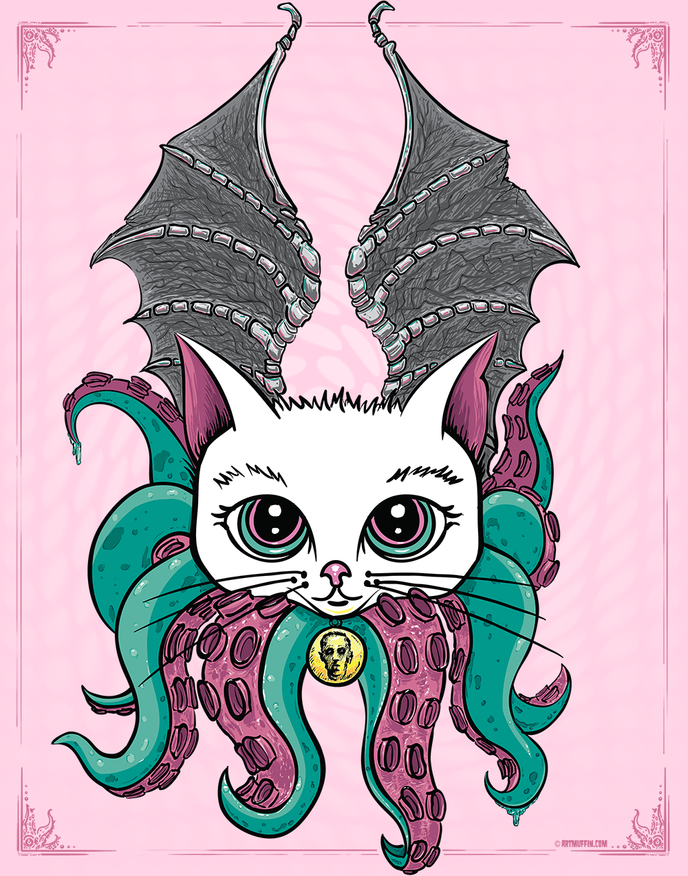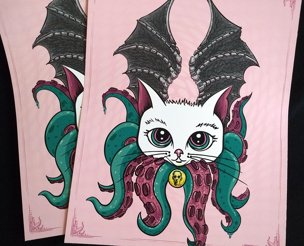 This 11" x 14" print is printed on 100lb. 'silk' card stock. Not too shiny but the finish isn't flat either. This print spawned from the Cathulhu sticker I created. People love the design and were asking for it as a print...so here we are!