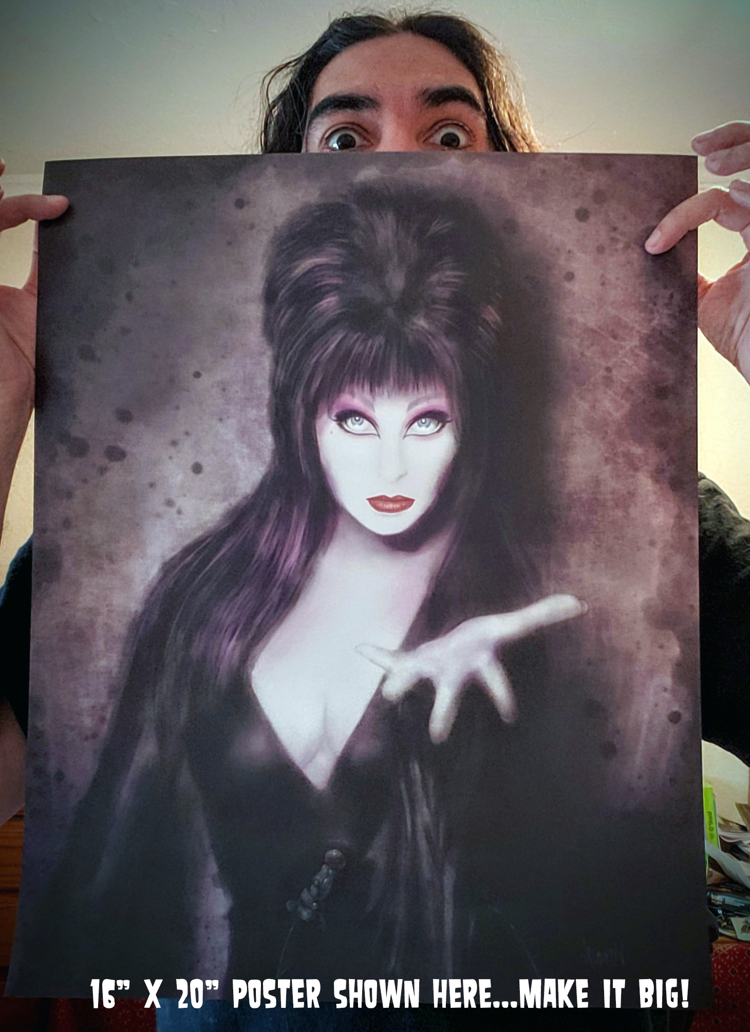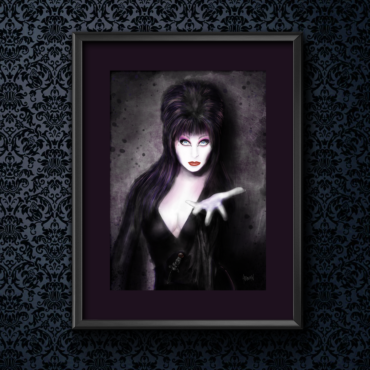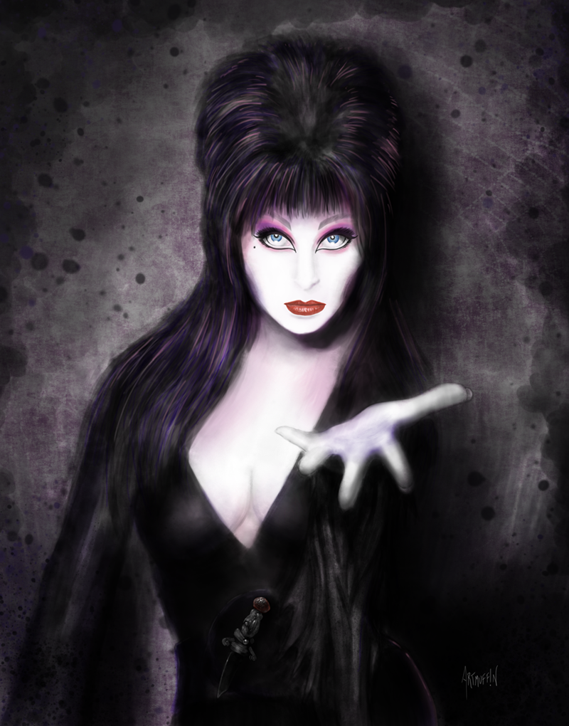 Our favorite B horror movie hostess Elvira. I remember seeing her for the first time and thinking she was going to be scary and evil. Then she started joking around about the camp value of the coming attraction and there were props flying around on set. To me it made her much more fun and accessible. I always knew it would be something fun and ridiculous if Elvira was on the screen. I figured it's time to paint a portrait of her to add to my collection of horror movie icons. I hope you like the final piece!