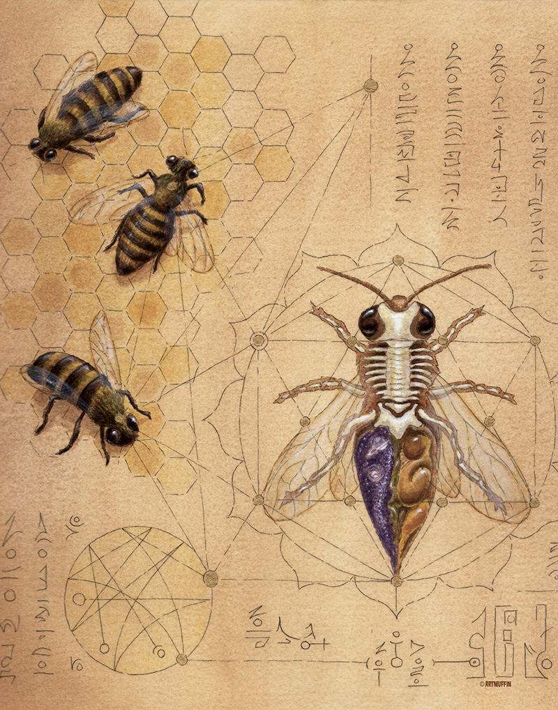 An illustration of what may have been a study of bees and creation or evolution. The larger bee, shown as an anatomical illustration shows a strange blend of anatomically correct insides, an almost human skeletal structure, and a microcosm in the back end (abdomen) of the bee. What appears to be the symbol of the heart chakra also appears around the large bee in addition to the hexagonal shape within the chakra symbol and matching the honeycomb. Other strange symbols are throughout.